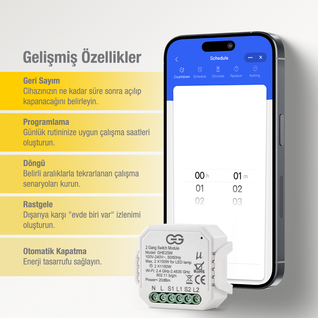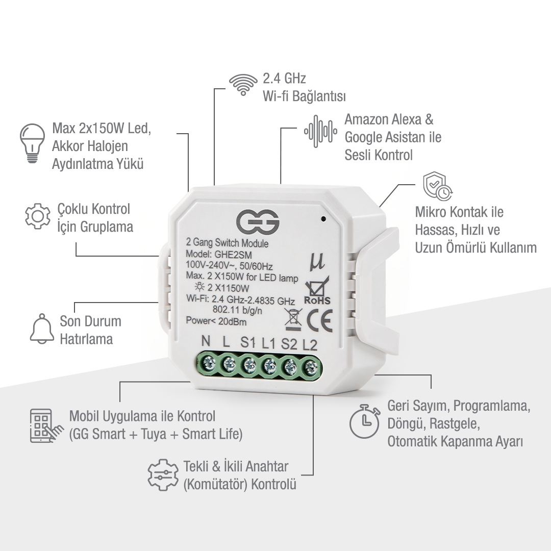 2.4 GHz Wi‑Fi bağlantısı ile çalışan cihaz, GG Smart / Tuya Smart / Smart Life uygulamaları üzerinden dünyanın her yerinden kontrol edilebilir. Zamanlama, geri sayım ve otomasyon senaryoları oluşturarak aydınlatmalarınızı ihtiyacınıza göre yönetebilirsiniz.