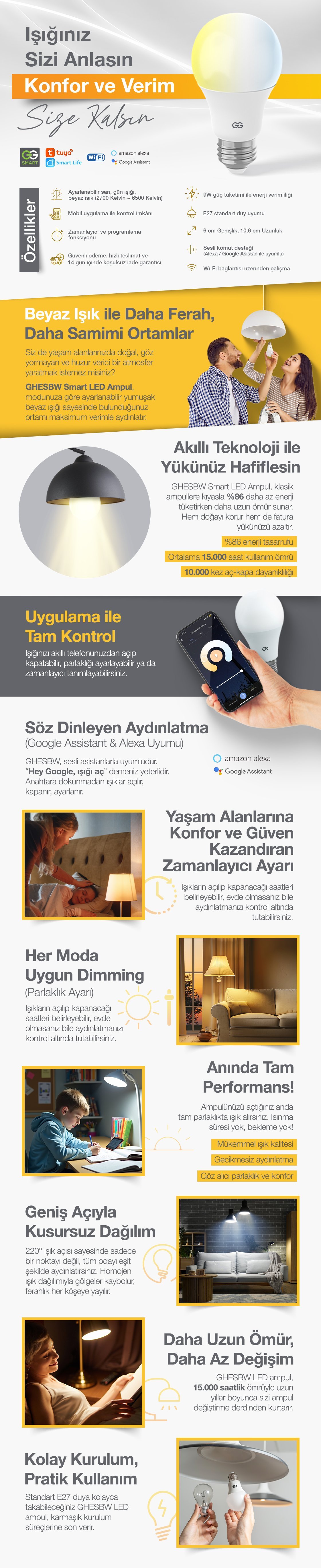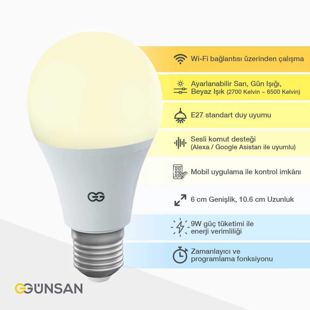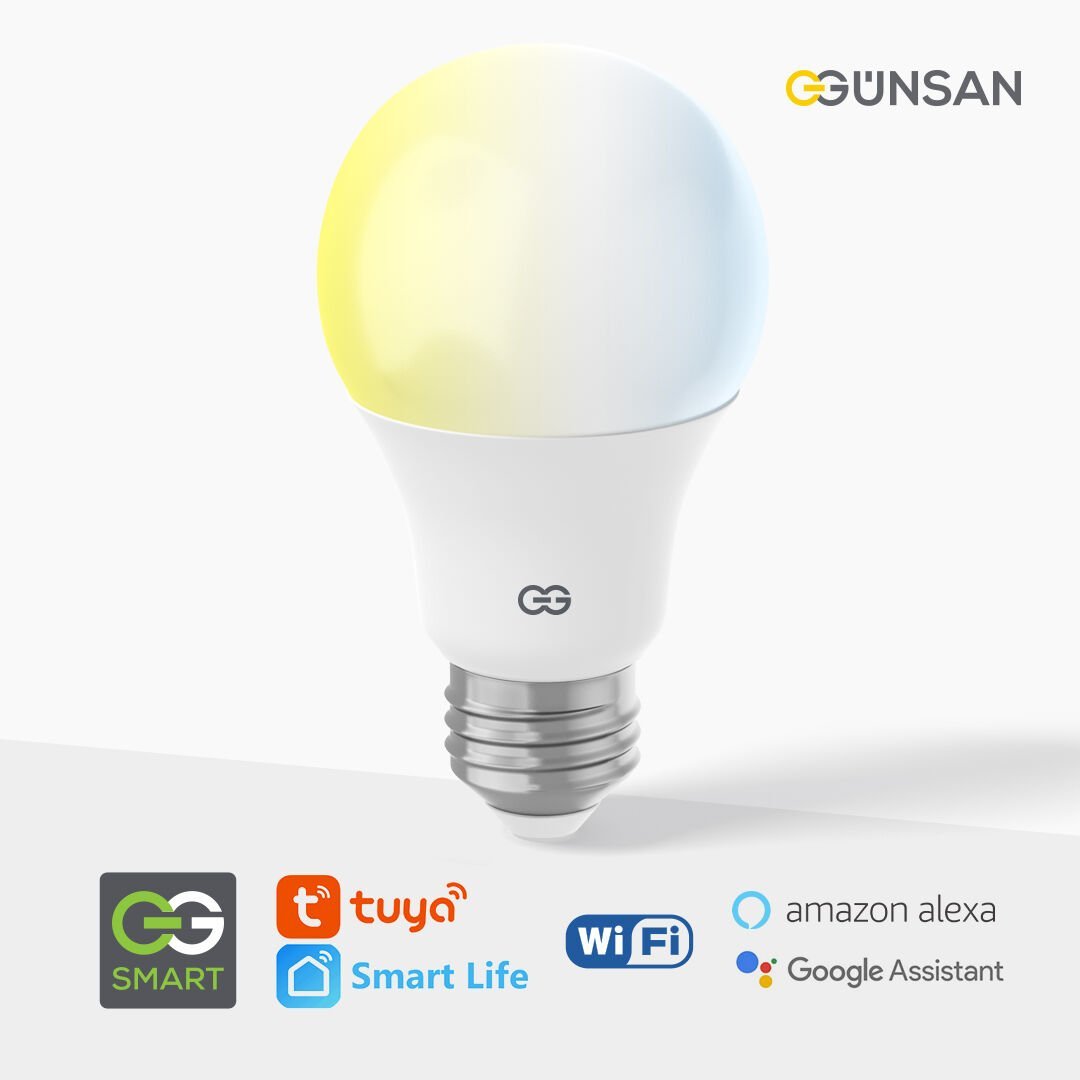 Günsan Akıllı Wifi LED Ampul Beyaz Işık Tuya ve Smart Life Uygulama Destekli (9W 2700K-6500K Ayarlanabilir)