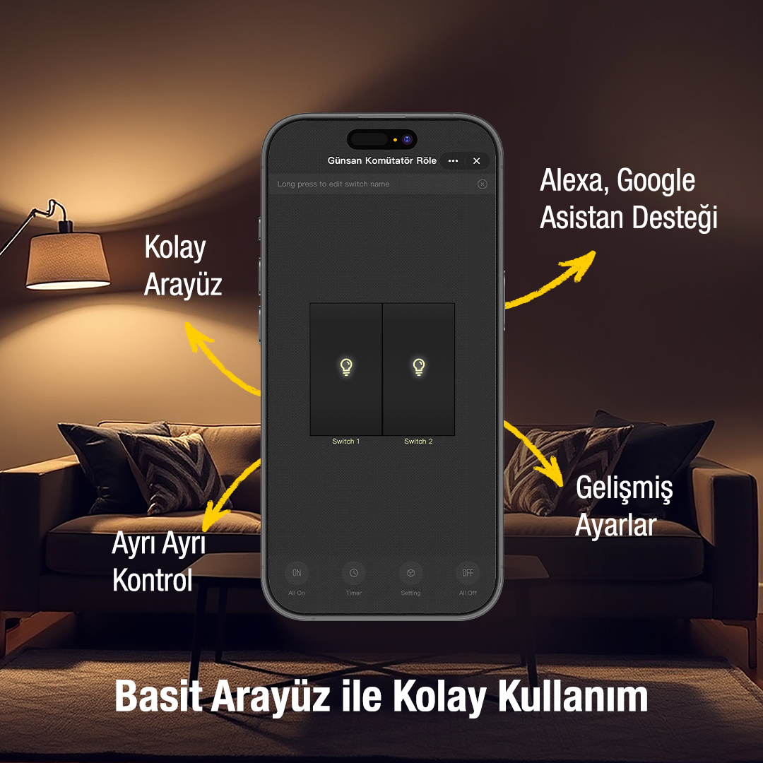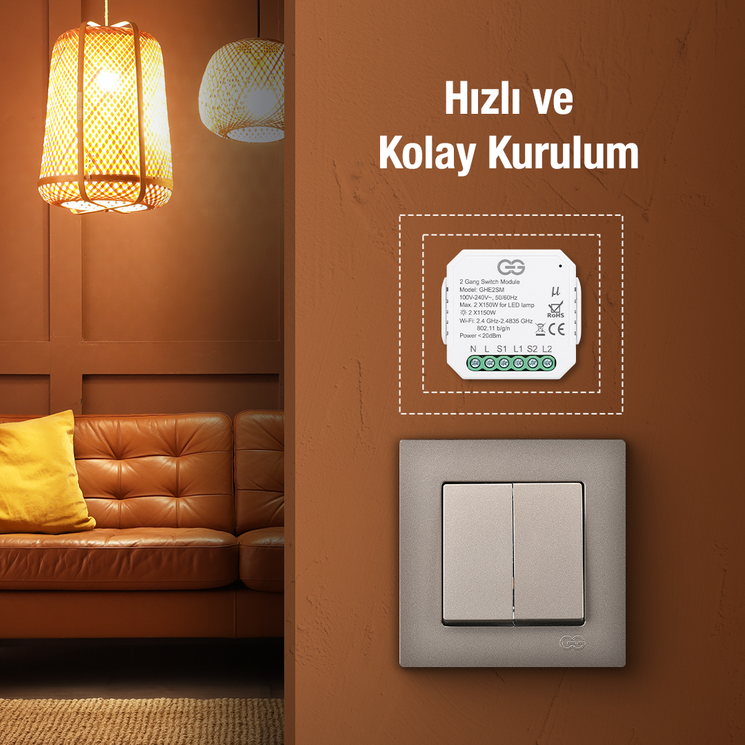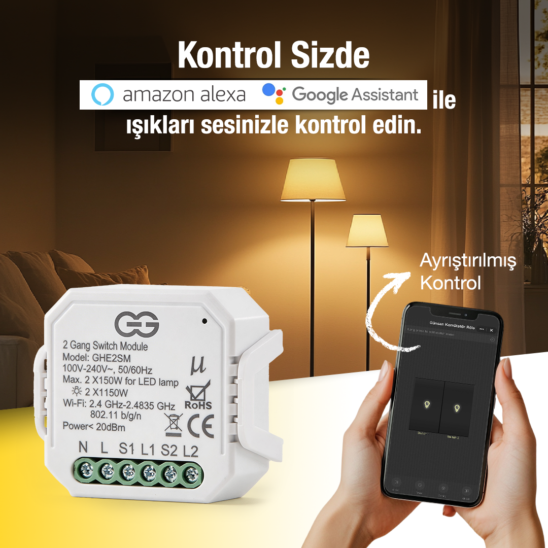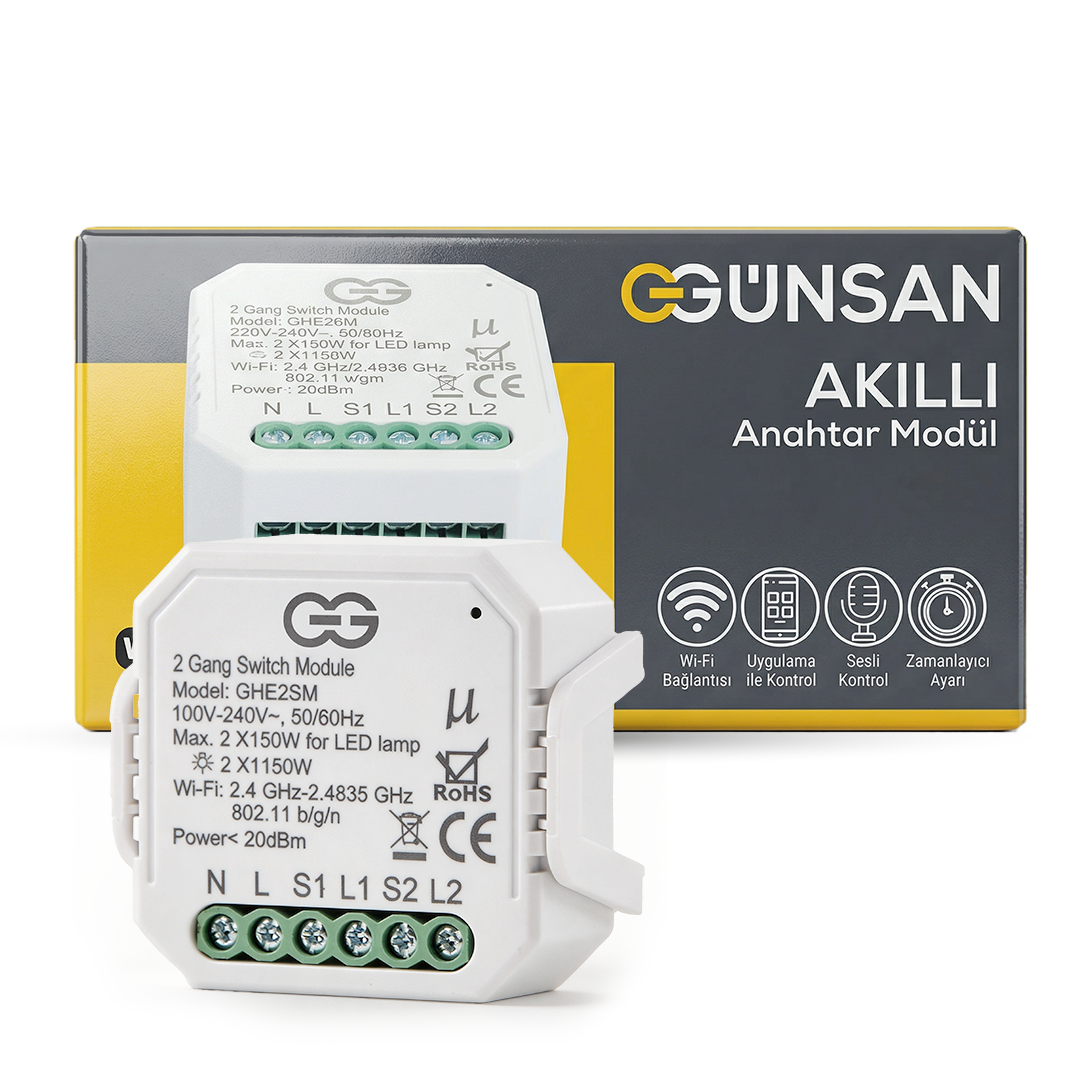 Günsan 2’li Akıllı Wi‑Fi Anahtar Modülü, ev ve ticari alanlarda mevcut elektrik tesisatını bozmadan aydınlatmaları akıllı sisteme dönüştürmek isteyen kullanıcılar için geliştirilmiş pratik ve güvenilir bir çözümdür.