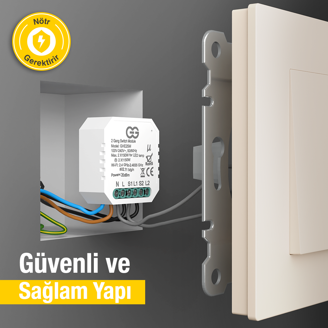 Günsan Akıllı WiFi Nötrlü Komütatör Röle 2 Kanal (İkili Anahtar Modülü) Tuya & Smart Life Uyumlu