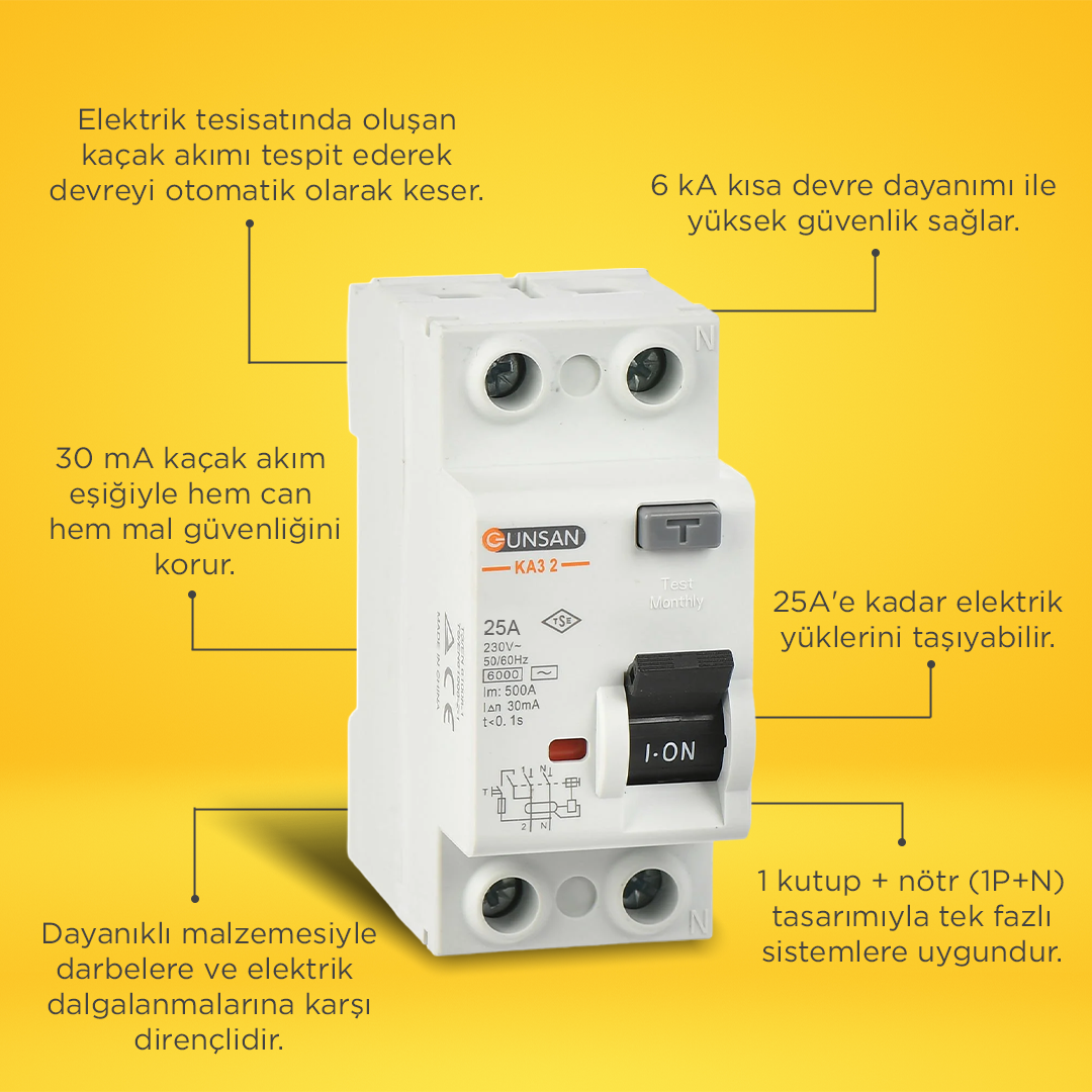 - Güç Kontrolü: 30 mA seviyesinde bir kaçak akım tespit edildiğinde devreyi otomatik olarak keser. Anahtar, 25A gücüne kadar olan elektrik yüklerini taşıyabilir niteliktedir.