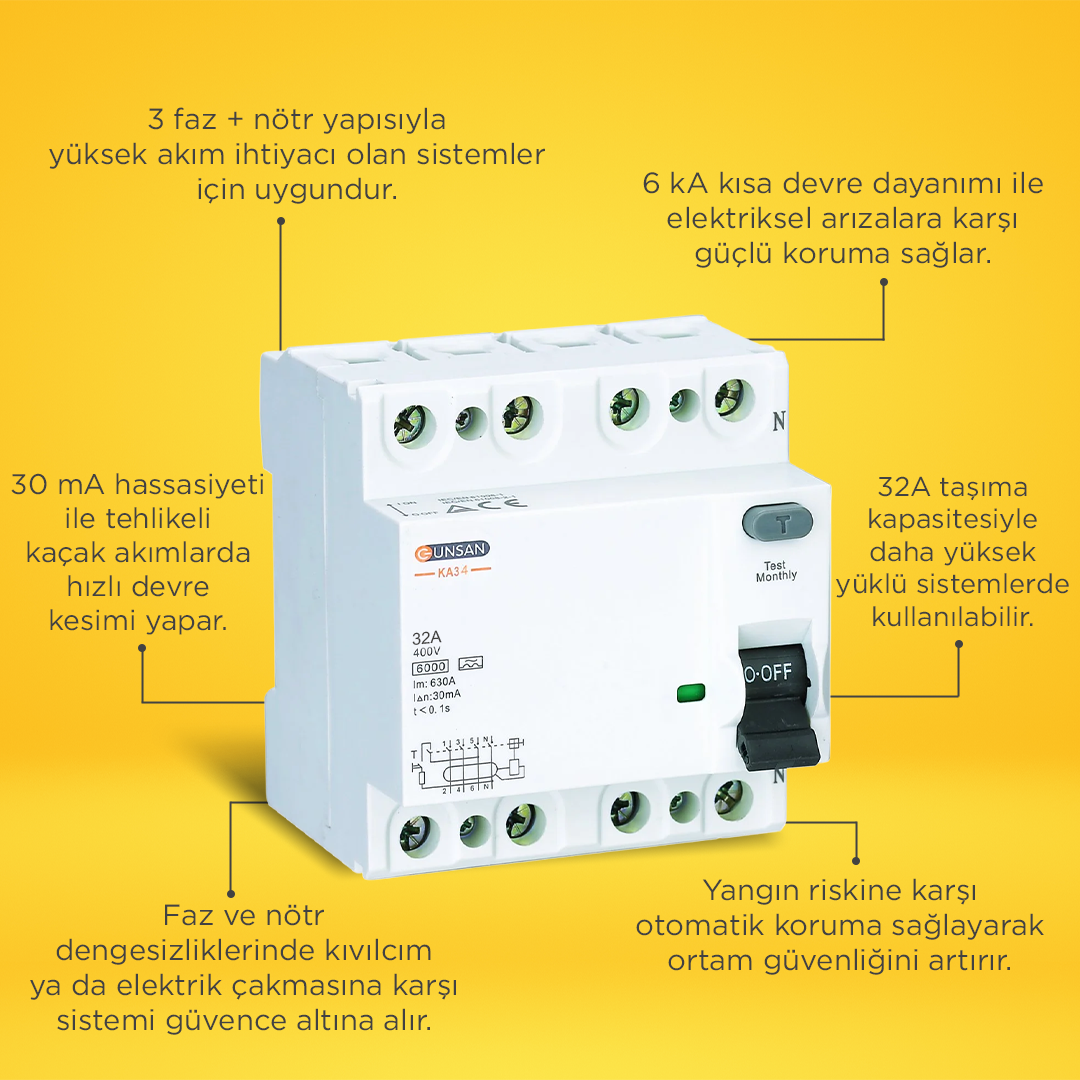 Günsan Valta Kaçak Akım Koruma Anahtarı 6 kA 3 Kutup +Nötr 30 mA 32A, elektrik devrelerini faz ve nötr dengesizliğine karşı korur. Olası gerilim uyuşmazlığından dolayı oluşabilen kıvılcım ya da elektrik çakmasına karşı koruma sağlar. Yangın gibi tehlikeli durumlarda akımı keserek sistemi korurken bulunduğu ortamı güvende tutar. Öne çıkan başlıca özellikleri: