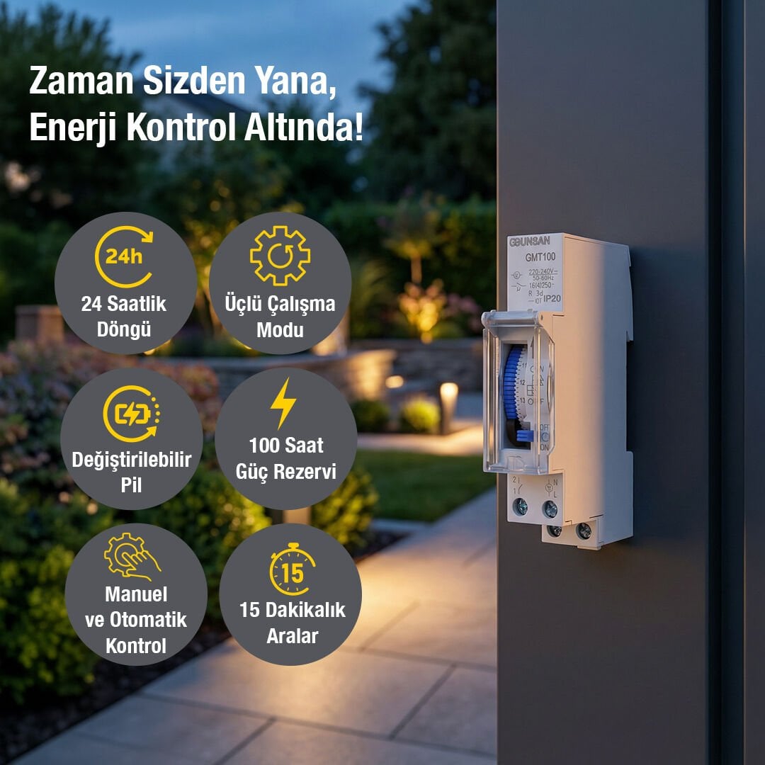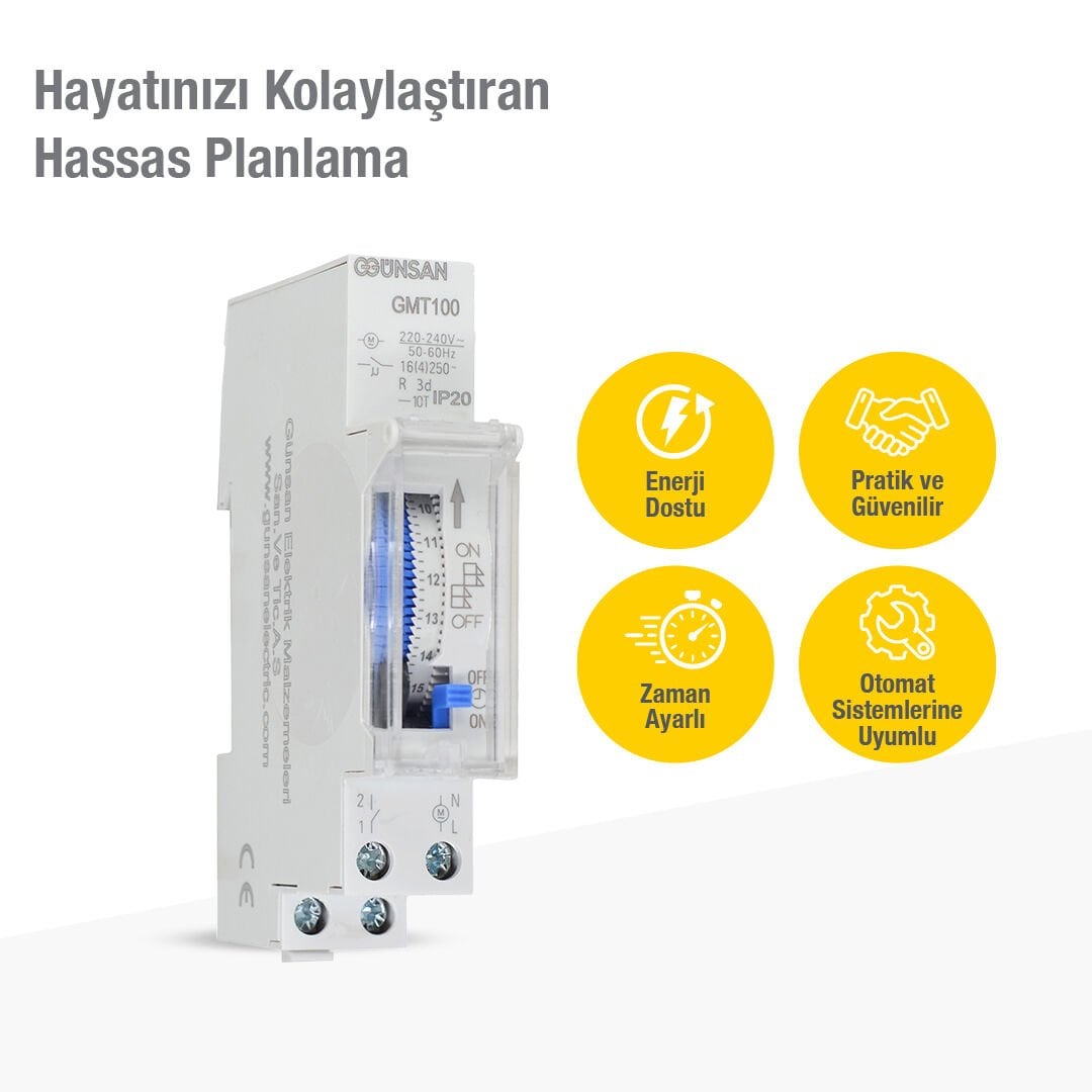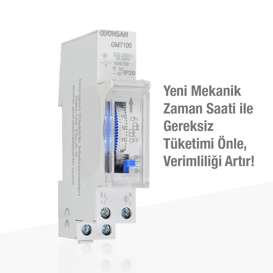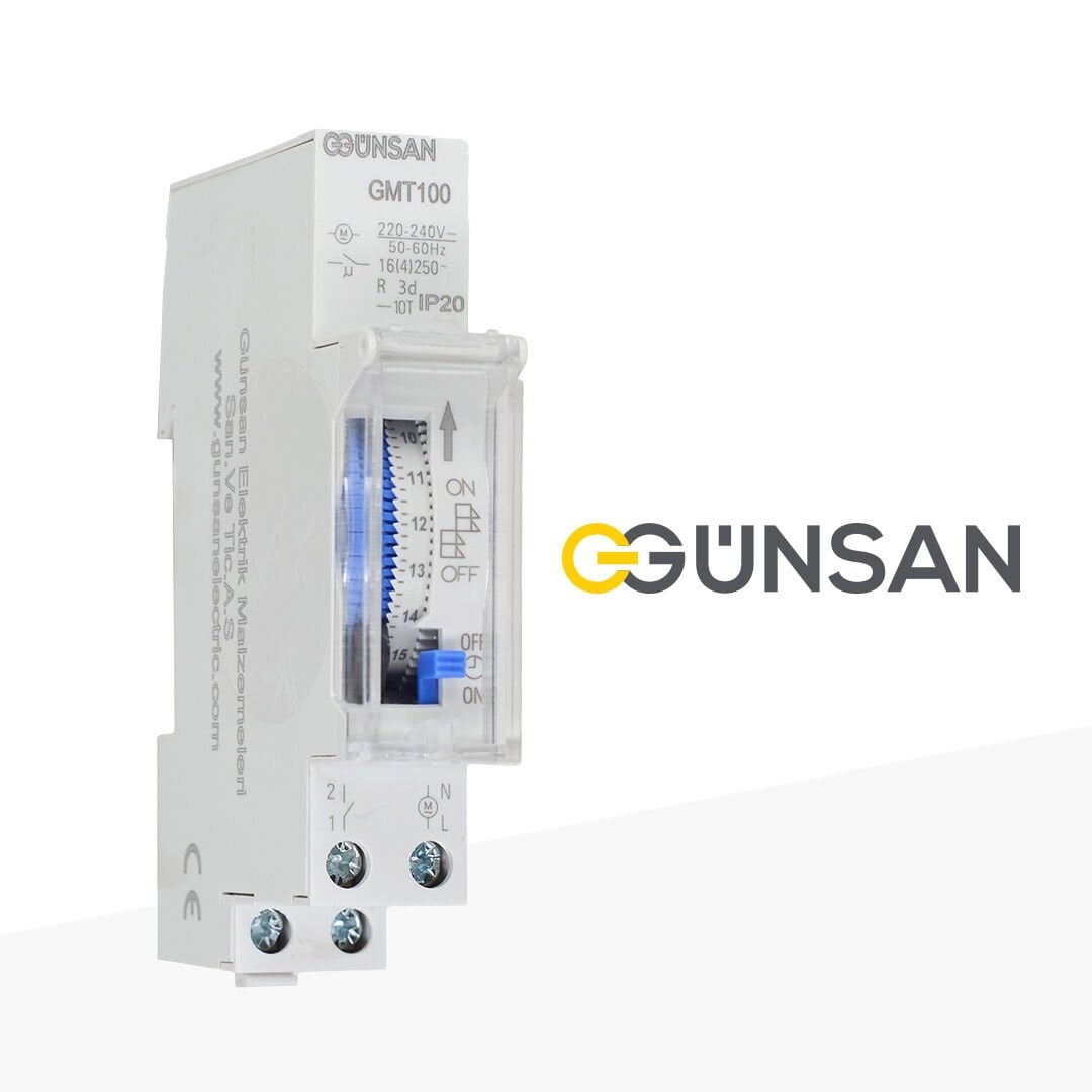 Günsan GMT100 Mekanik Zaman Saati, elektrikli cihazların belirlenen zaman aralıklarında otomatik olarak çalışmasını sağlayarak hem enerji tasarrufu hem de kullanım kolaylığı sunan güvenilir bir zaman kontrol çözümüdür. 24 saatlik döngü yapısı sayesinde günlük açma‑kapama programları pratik şekilde ayarlanabilir.