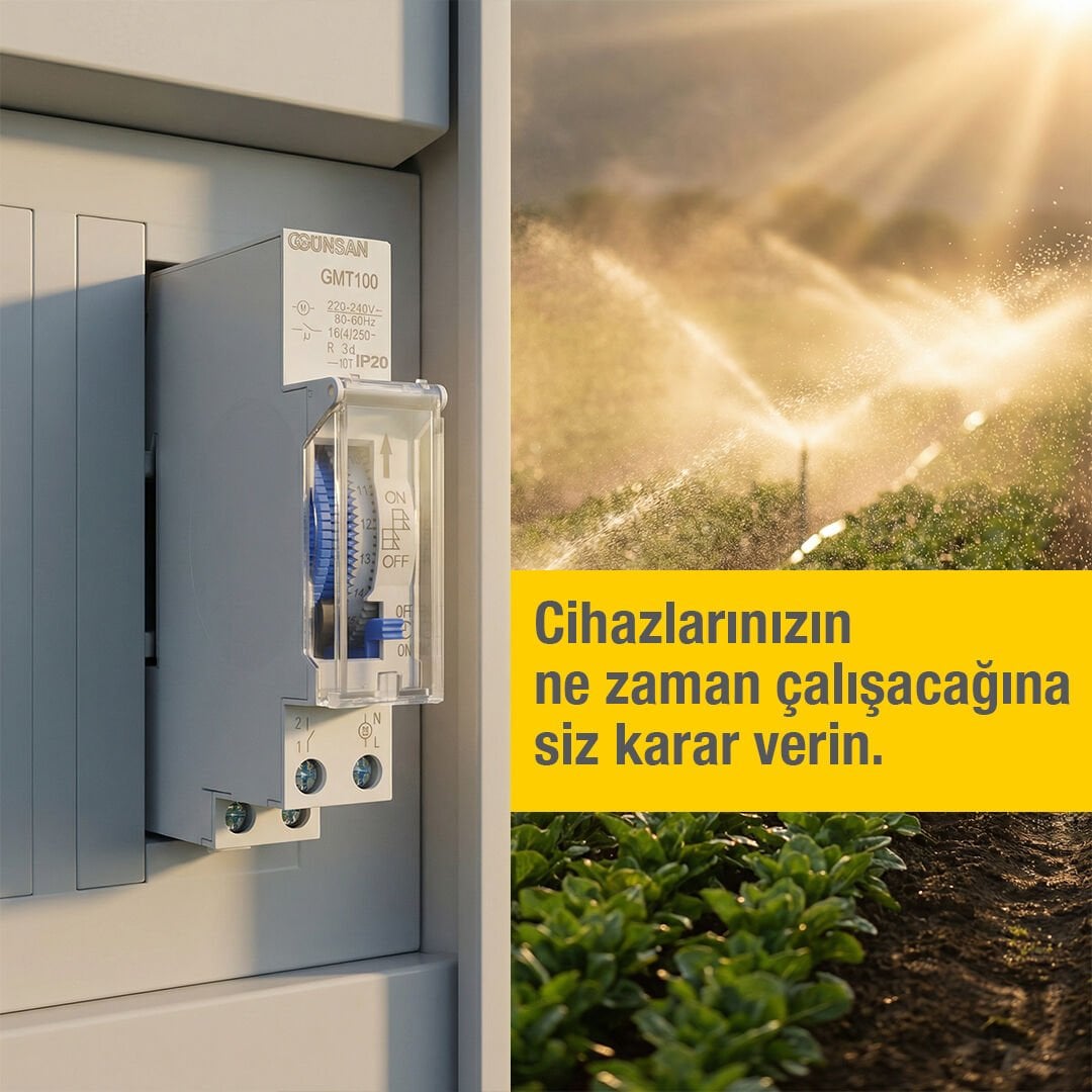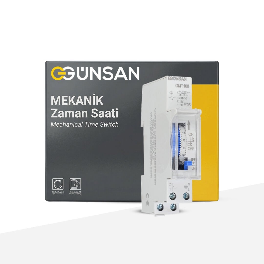 Günsan GMT100 Mekanik Zaman Saati, elektrikli cihazların belirlenen zaman aralıklarında otomatik olarak çalışmasını sağlayarak hem enerji tasarrufu hem de kullanım kolaylığı sunan güvenilir bir zaman kontrol çözümüdür. 24 saatlik döngü yapısı sayesinde günlük açma‑kapama programları pratik şekilde ayarlanabilir.