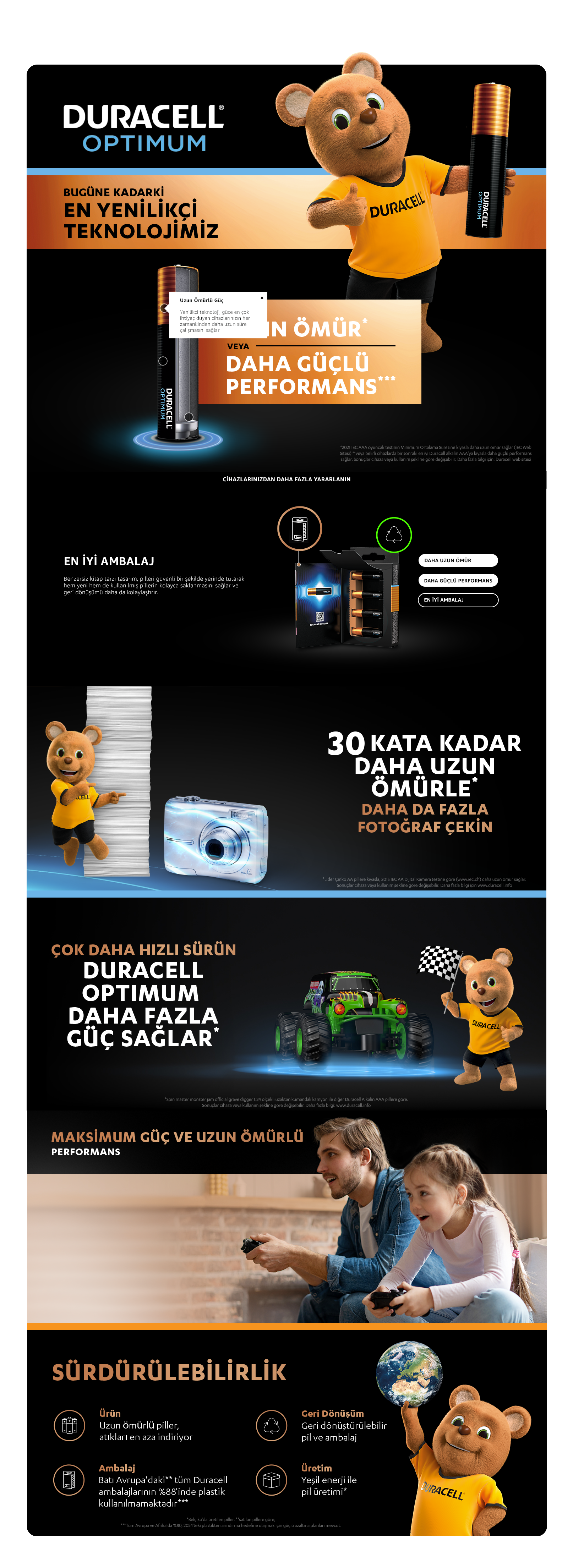 Duracell Optimum pillerle cihazlarınıza beklediğiniz uzun ömürlü gücü ve performansı verin. En iyi performansa sahip AAA pilimiz, her gün kullandığınız modern, üst düzey cihazların talepleri için optimize edilmiştir. Daha Uzun Ömür* veya Daha Güçlü Performans** ile elektronik cihazlarınızı en yüksek performansta çalıştıklarını bilerek rahatça kullanın. Çocuklarınız RC arabalarla oynarken veya siz uzaktan kumandanızla yeni bir dizi sezonu izlerken, mutlaka Duracell Optimum pilleri kullanın.